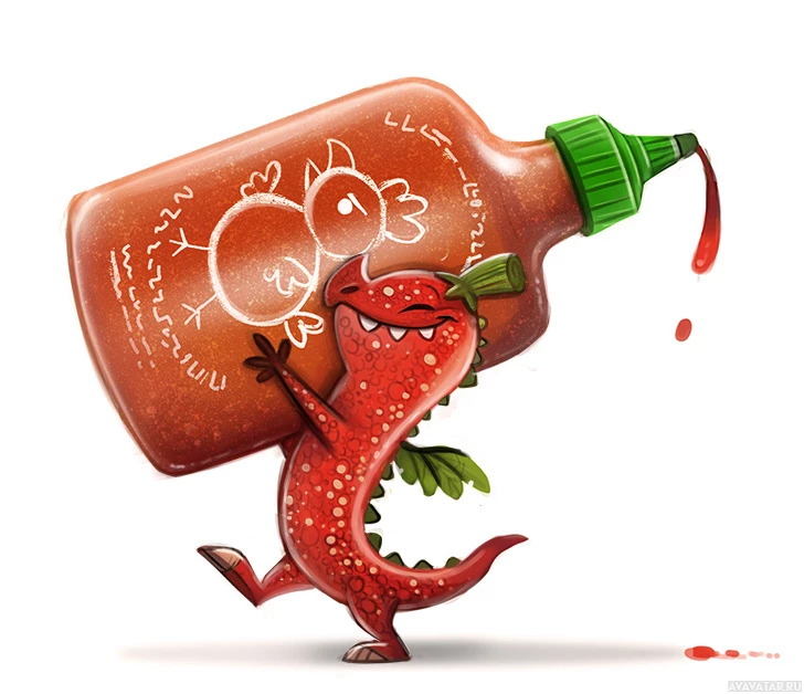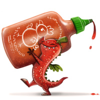 Sriracha Sauce," suggesting the character may be excited about or fond of this particular brand of sauce. The bottle has a spout, through which red liquid is pouring out, indicating the spiciness of the sauce and the dragon's enthusiasm for it. The background of the image is simple and does not contain any additional objects or elements, focusing the viewer's attention on the dragon and its action with the hot sauce bottle. The art style is colorful and dynamic, aiming to convey a sense of fun and adventure.