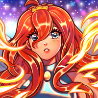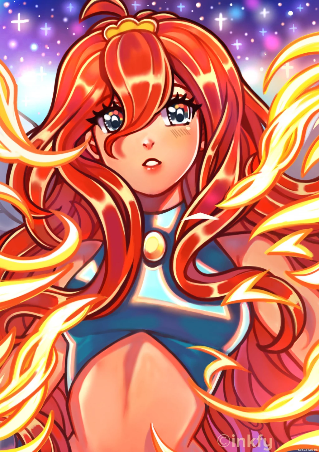 sparkling stars, contributing to the fantastical theme of the artwork. There are also elements that look like flames around her right hand, which adds a dynamic and possibly magical element to the character's depiction.