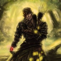 monster hunter. They are dressed in armor and holding a weapon, suggesting they may be preparing for or engaged in battle against a monster or creature. The environment looks like a forest or woodland, adding to