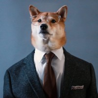 The image features a Shiba Inu dog dressed in