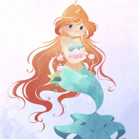red hair and is wearing a shell top, typical of depictions in fantasy stories or cartoons. She is also holding what appears to be a flower in her hand. The background suggests