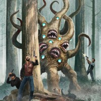 a forest setting, with a monster that resembles an octopus or squid towering over them. One man is holding a gun and pointing it at the creature, while another man is aiming a flashlight or lantern at the monster's eyes. The overall scene suggests an action-adventure or fantasy genre, possibly depicting a confrontation between humans and