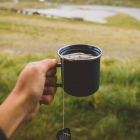 The image shows a hand holding a cup of tea, possibly on a mountainous terrain. There are snow-capped mountains in the background, suggesting a high-altitude environment. The focus is on the person and their cup of tea, with the natural landscape serving as a scenic backdrop.