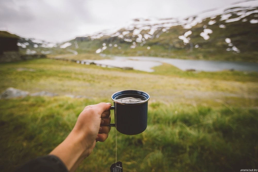 На картинке изображена рука, держащая чашку чая, возможно, на горной местности. На заднем плане есть заснеженные горы, что говорит о высокогорной среде. Основное внимание уделяется человеку и его чашке чая, а природный ландшафт служит живописным фоном.
