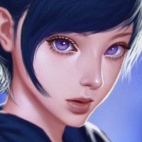 blue hair and striking purple eyes that are looking directly at the viewer. The character appears to have some facial features in common with those found in anime or manga styles, such as the large