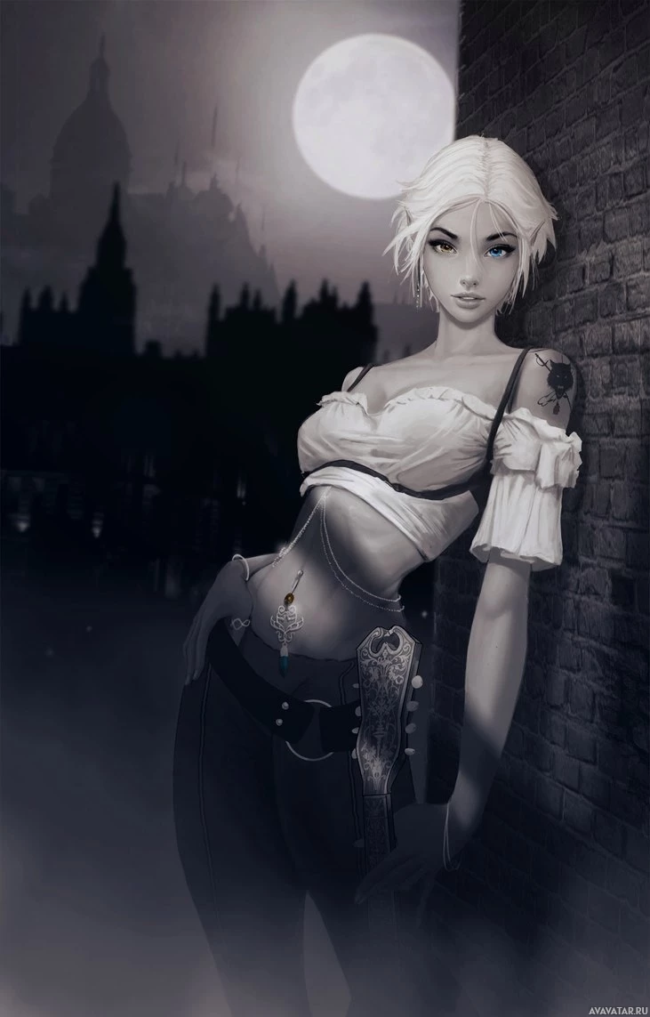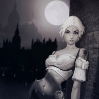 fantasy aesthetic of her appearance. The background hints at a night scene with