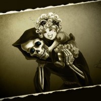 The image depicts a whimsical and surreal scene featuring a skeleton figure with a somewhat cheerful expression, holding