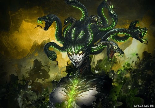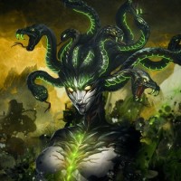 a fantastical character that appears to be an interpretation of Medusa, the Greek mythological Gorgon known for her ability to turn people to stone with a single glance. This portrayal features Medusa with multiple snake heads in place of a typical