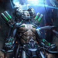 a science fiction scene featuring an individual who appears to be a blend of human and robotic features. This character has the body of a human with visible mechanical parts, suggesting