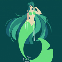 green hair, is wearing a shiny green and white swimsuit with pearls around the neckline and at her waist, and she has a tail that resembles a fish's fin. The background is a gradient of teal and