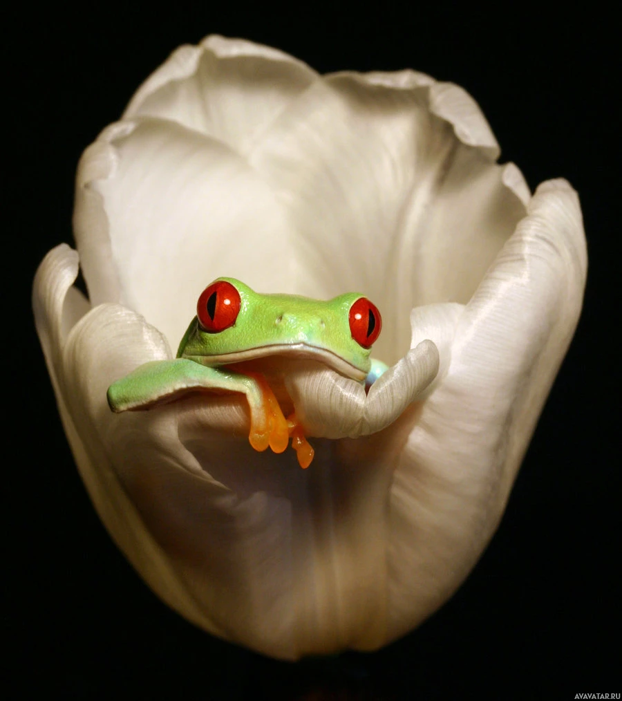 red eyes resting within the calyx of a white flower, which is commonly known as a tulip. The frog appears relaxed and comfortable in its unusual habitat, indicating a sense of