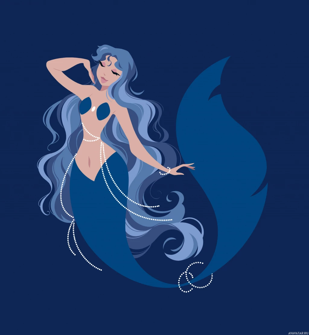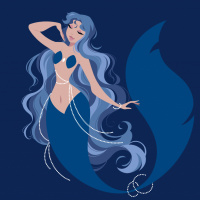a dreamy state. She appears to be wearing some type of garment or top that resembles the shells often associated with mermaids. The background is a solid color, which contrasts with her