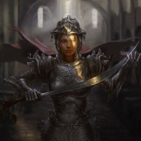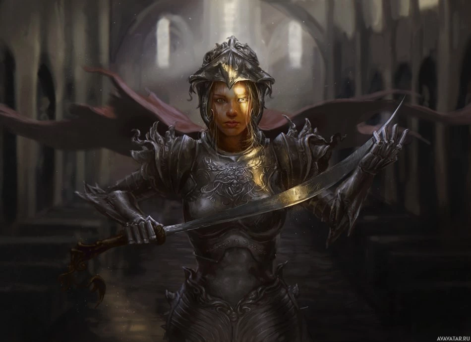 a female figure dressed in armor, standing in what appears to be an old or medieval setting. She is holding a sword in her right hand and has a shield with