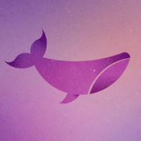 The image contains a graphic of a whale. It is stylized with simple shapes and colors, featuring pink and purple hues against a light blue background. This design could be used for various purposes such as a logo or an icon related to marine life or conservation efforts.