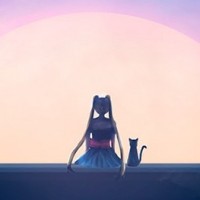an animated character sitting on the edge of a body of water, possibly a lake or ocean, with their hands resting on their knees. They are wearing a pink and white outfit that suggests a magical or fantasy theme. Next to them is a cat perched comfortably atop a rock, looking towards the viewer. The