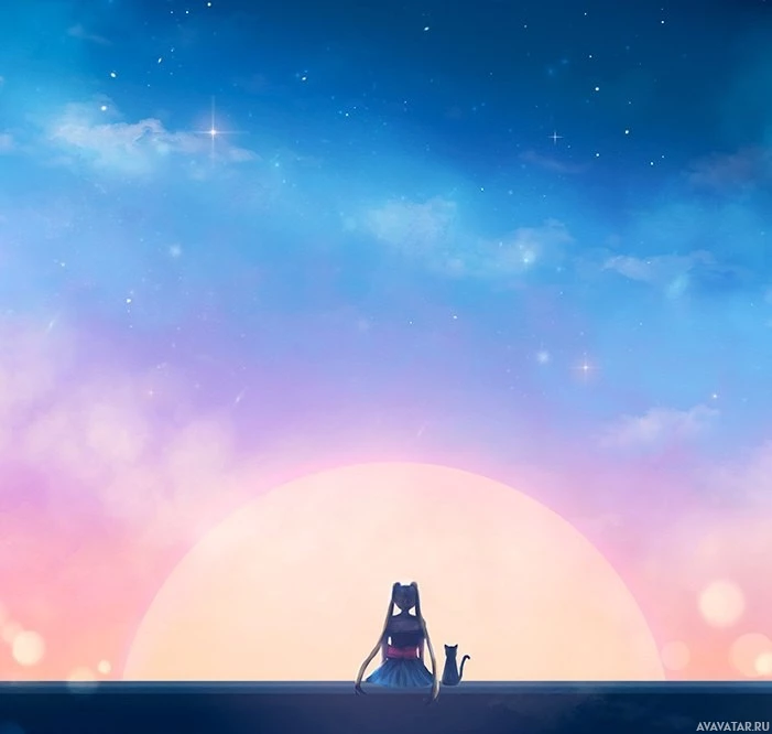 full moon hangs in the sky above, adding to the tranquil atmosphere of the scene. The overall composition and style are reminiscent of anime-inspired artwork.