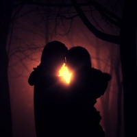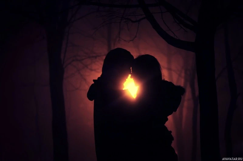 a forest at nighttime. The scene evokes feelings of closeness and affection, often associated with