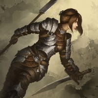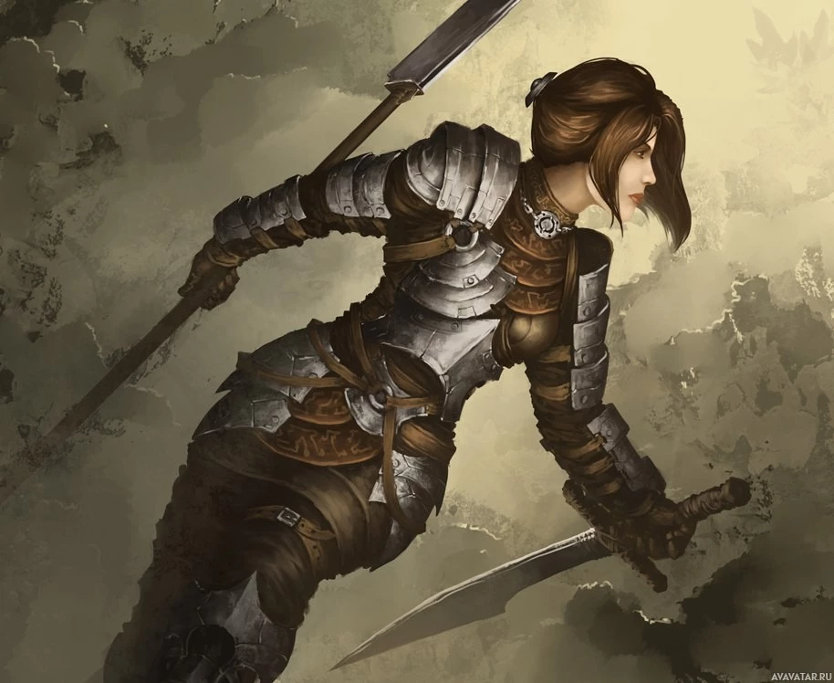 a female character in armor, wielding a sword. She appears to be engaged in combat or preparing for battle. The background has