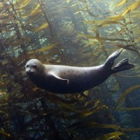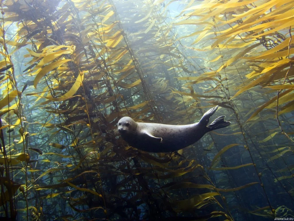 На картинке изображен тюлень, плавающий под водой среди подводной растительности, которая, по-видимому, является водорослями. Тюлень отдыхает или плавает в воде, окруженный растениями, которые предполагают водную среду, типичную для местообитаний морской жизни.