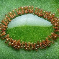 На картинке изображена большая группа муравьев, образующих форму круга со своими телами. Это известно как «грибок» или аналогичное расположение, когда муравьи создают защитный барьер вокруг какого-либо интересующего их объекта или вещества, такого как пища или потомство. Муравьи известны своим социальным поведением и способностью работать вместе в сложных структурах.