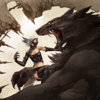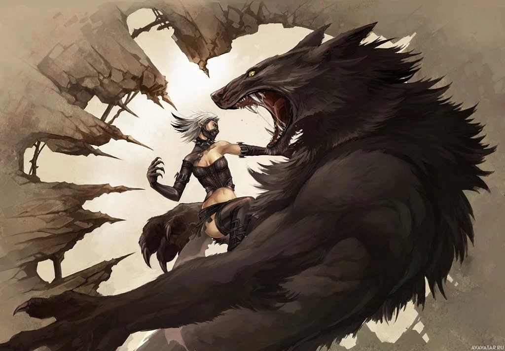 The image depicts a fantasy-themed scene featuring a werewolf and
