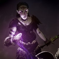 character on the right appears to be holding a staff that is glowing purple, which might indicate magical or mystical properties. The setting seems to be dark or shadowed, possibly indicating