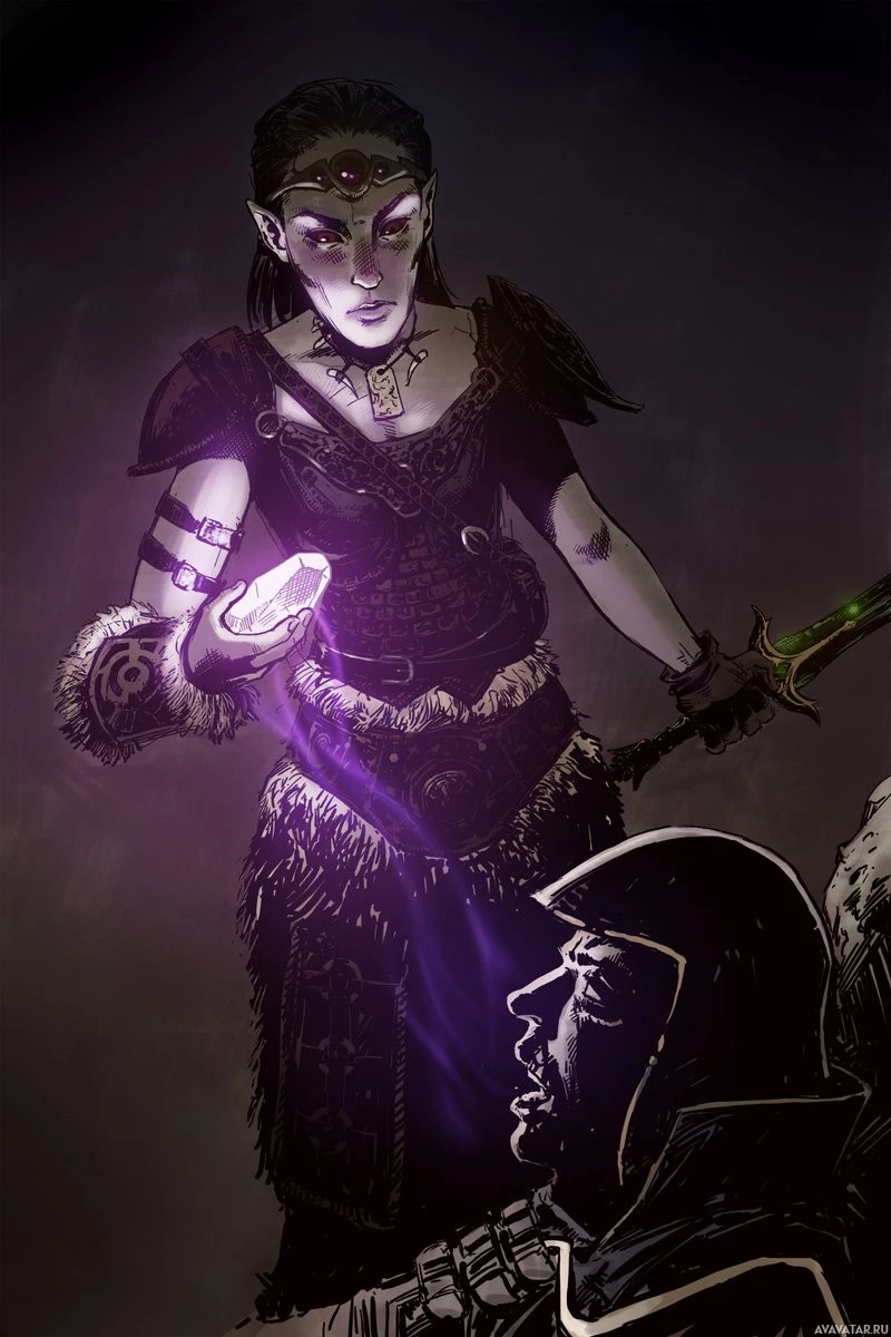 a night scene or a location with dim lighting. The characters could be part of a narrative involving elves, magic, and adventure, consistent with the game "The Elder Scrolls," known for its expansive
