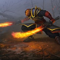 the video game Dota 2, known as Ember Spirit. This character is portrayed wielding a staff and two swords, with the staff having