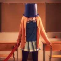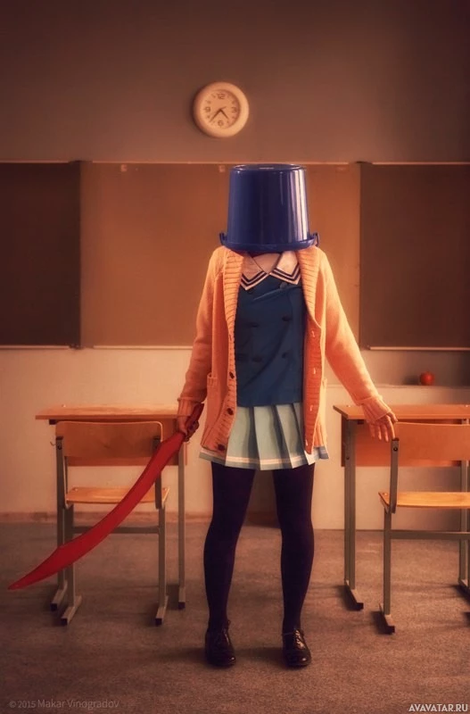 school uniform, complete with a blazer and short skirt. The person is holding a red book or folder up to their face, possibly in a playful gesture, and is standing in front of desks which could suggest this is