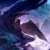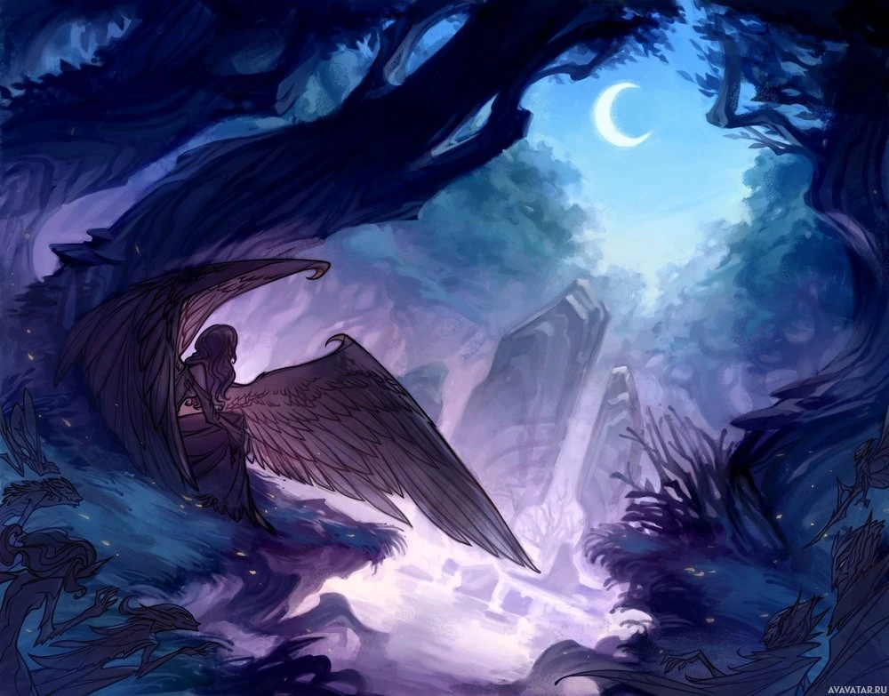 a fantasy scene featuring an angelic figure with large wings standing amidst a forest at night. The angel appears to be gazing upwards, possibly observing