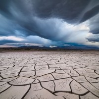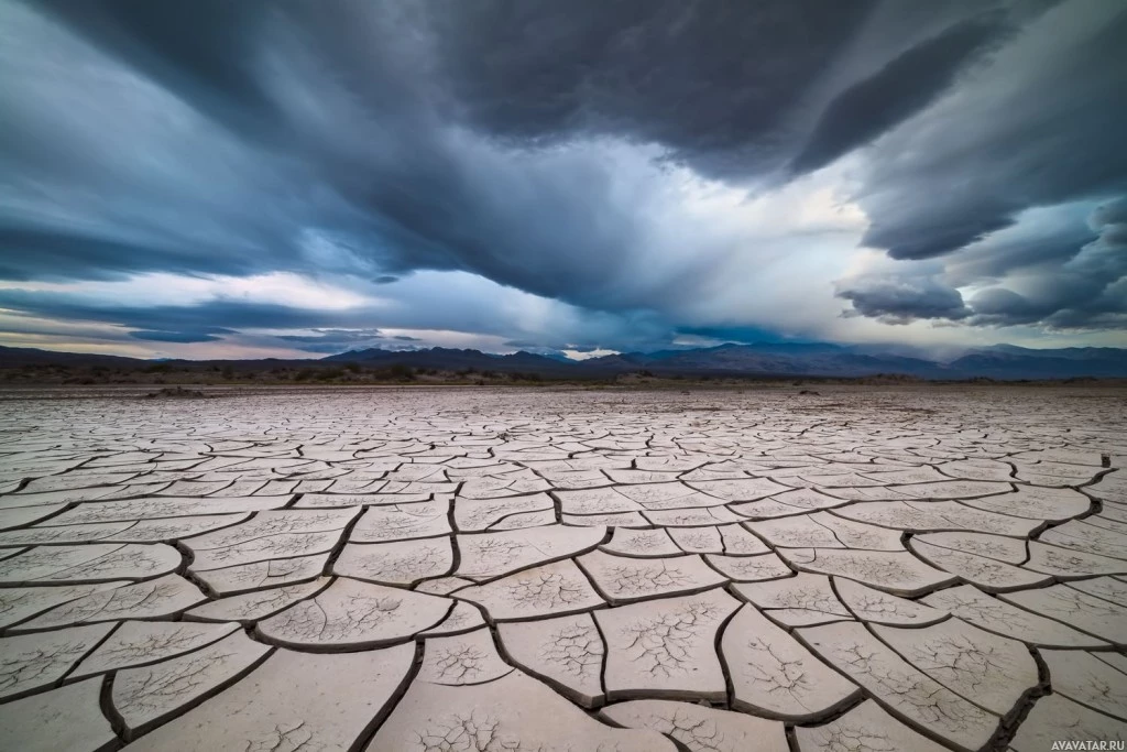 a barren landscape, characterized by cracked earth and dry vegetation. It appears to be a desert, as indicated by the presence of what looks like salt flats or a similar