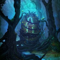 forest scene with otherworldly elements. There is a large, glowing egg-like object in the center of the image, which seems to be