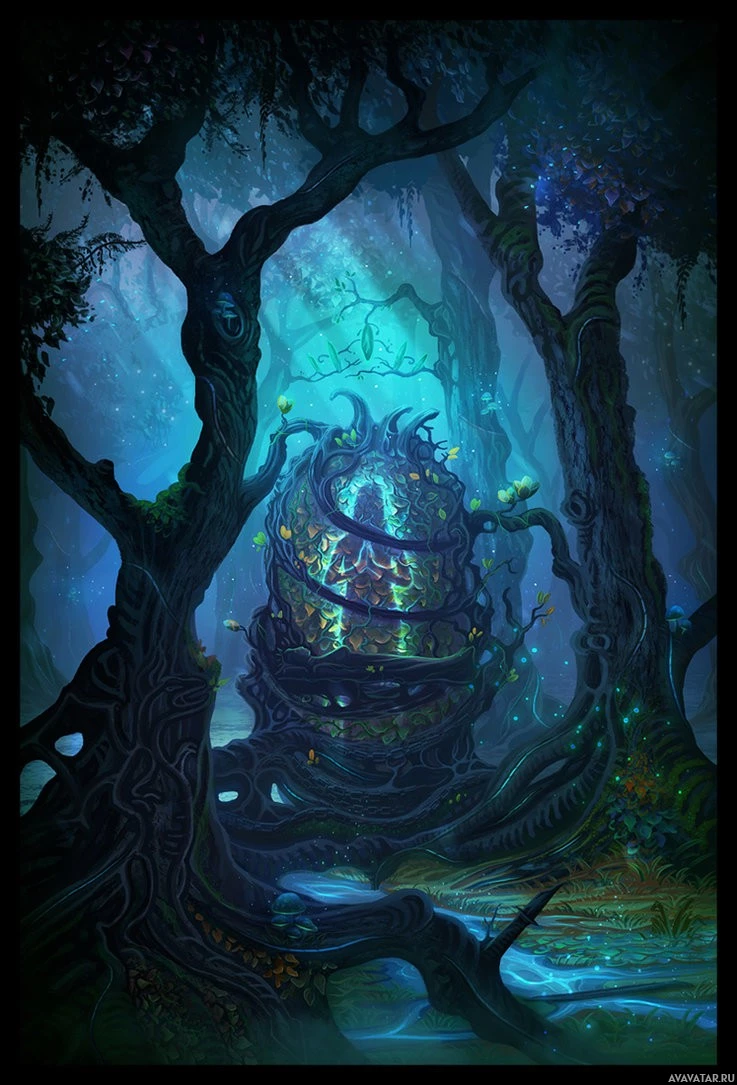 an eerie glow, giving the scene a mysterious and enchanting atmosphere. The overall color palette is dominated by blues and greens, which contribute to the magical