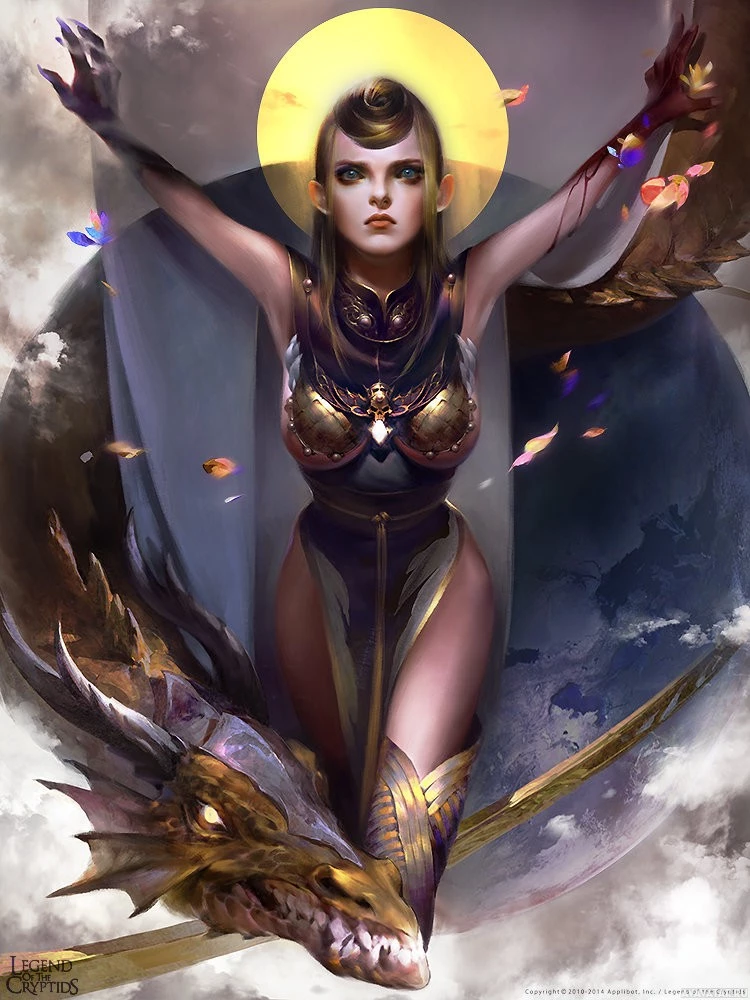 a confident posture, holding what appears to be a staff or a weapon. Behind her is a dragon, which is often associated with fantasy and mythology. The artwork has a detailed and vibrant quality, with a focus on the character's expression and