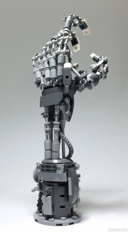 Lego figure stands on what looks like a base that might have a stand or other support structure. The color scheme is quite monochromatic with
