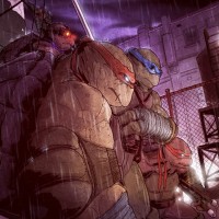 an urban environment at night. The artwork has a vibrant color palette that includes purples, blues, and blacks, which contributes to