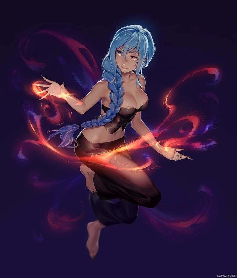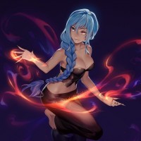blue hair. She is depicted in mid-action, as if she's casting a spell or performing some