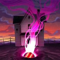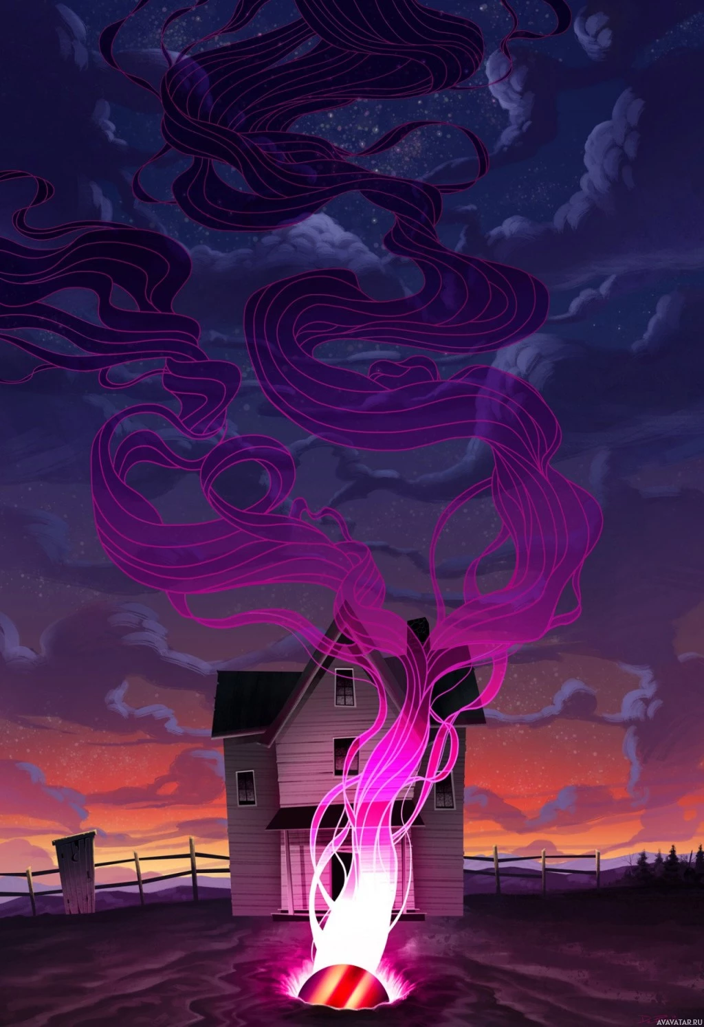 purple smoke or mist. These mystical elements are billowing towards the house, creating an ethereal or magical atmosphere. The sky is painted in