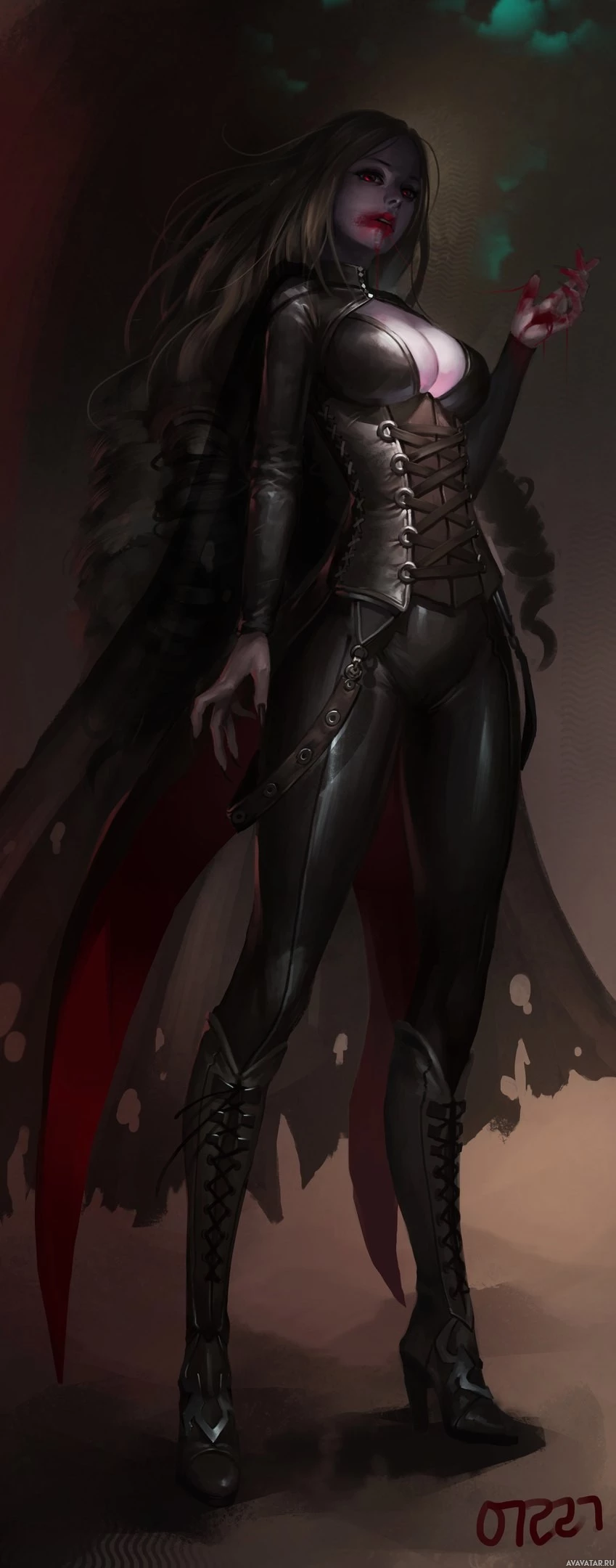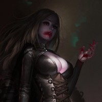 a female character who seems to be portrayed as a vampire or a fantasy figure. She is dressed in
