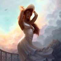 a white dress and has her hair styled in loose waves. The character is holding a hat on one hand, suggesting a relaxed or playful posture. The setting appears to be outdoors with the sky visible above, possibly indicating that it's either dawn or dusk due to