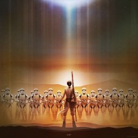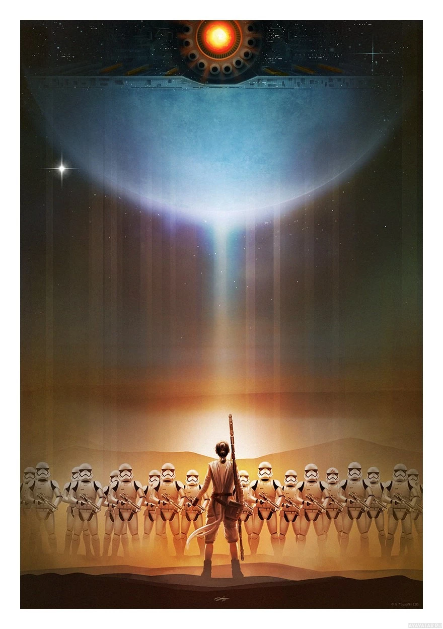 Star Wars: Episode VII". It features the character Rey, who is standing at the top of a sandy cliff with a stormtrooper below her. In the background, there are numerous other stormtroopers visible. The setting suggests a desert-like environment under a twilight sky, with a bright sun or