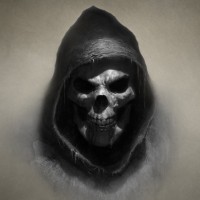 The image depicts a character wearing a hood and with a skull as part of their attire. The style appears to be reminiscent of the "Scream" mask from horror movies or similar iconography often associated with thriller or horror genres.