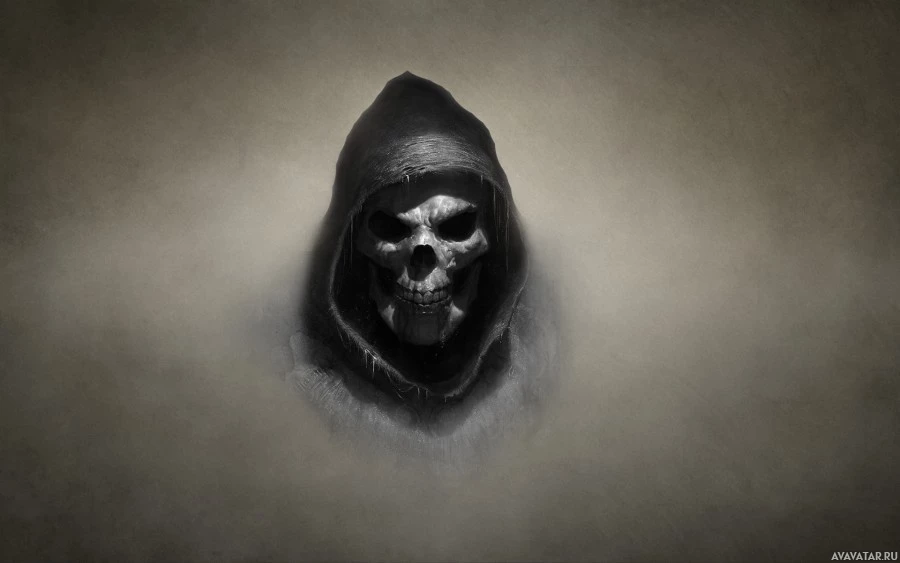 Картинка показывает персонажа, носящего капюшон и с черепом в составе одежды. Стиль, по-видимому, напоминает маску «Крик» из фильмов ужасов или аналогичной иконографии, часто связанной с жанрами триллеров или ужасов.
