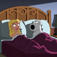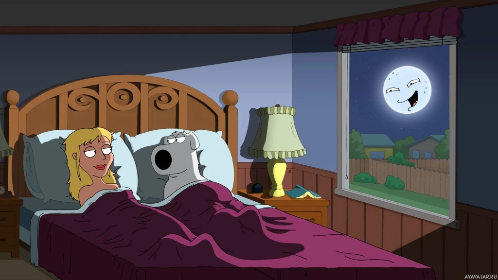 an animated scene featuring two characters in bed at night. One character appears to be a woman, and the other is a dog with human-like features, which resembles Brian Griffin from