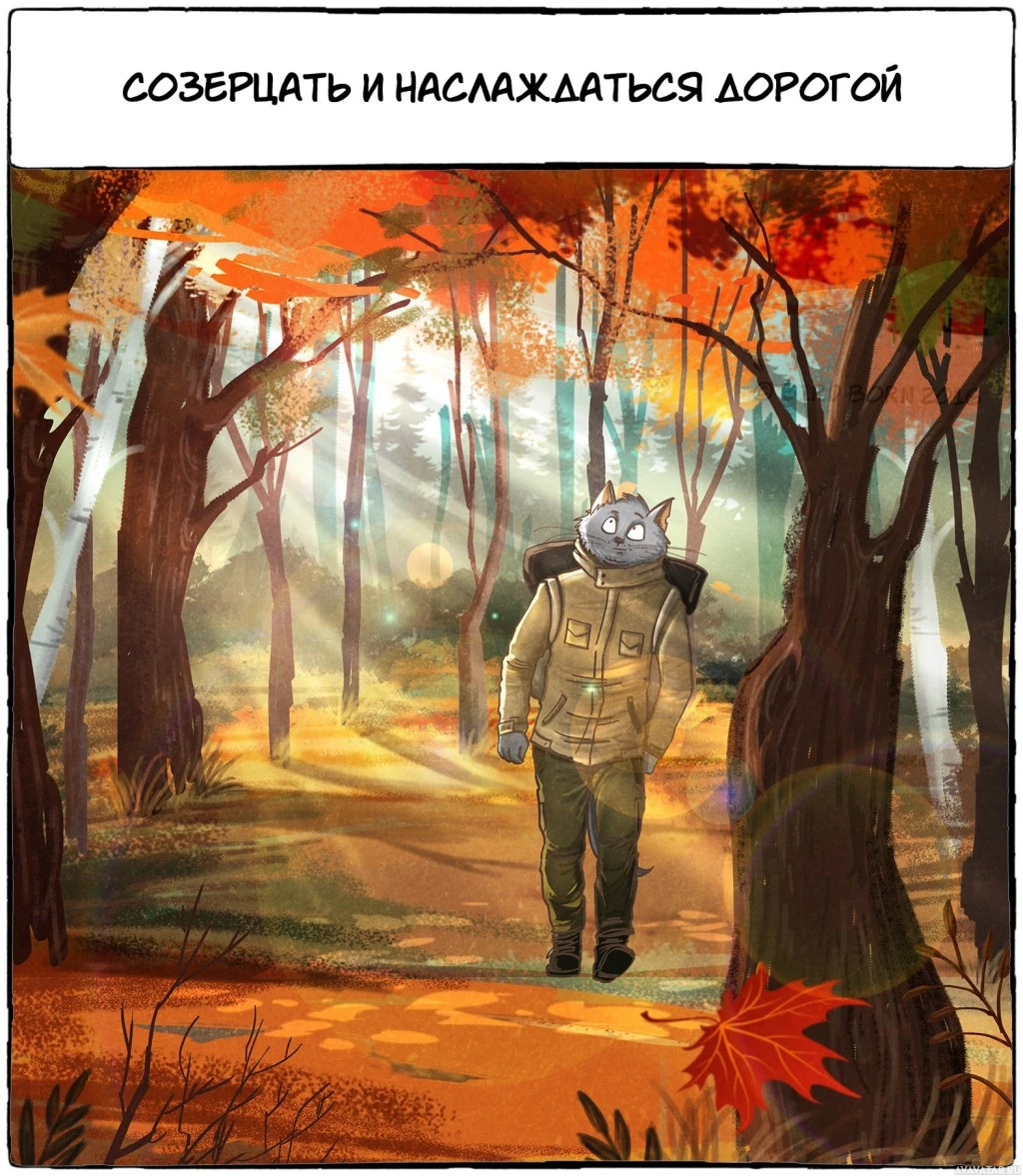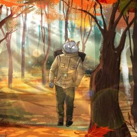 an illustrated scene with a cat that appears to be anthropomorphized, as it is dressed in clothing and standing on two legs, much like a human. The cat is wearing a backpack and seems to be exploring or walking through a forest during autumn, given the leaves on the ground and the foliage around. The style of the illustration is reminiscent of comic books or graphic novels, with