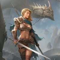 blonde hair, and she holds a sword in her right hand and a shield with a dragon emblem in her left. Behind her stands