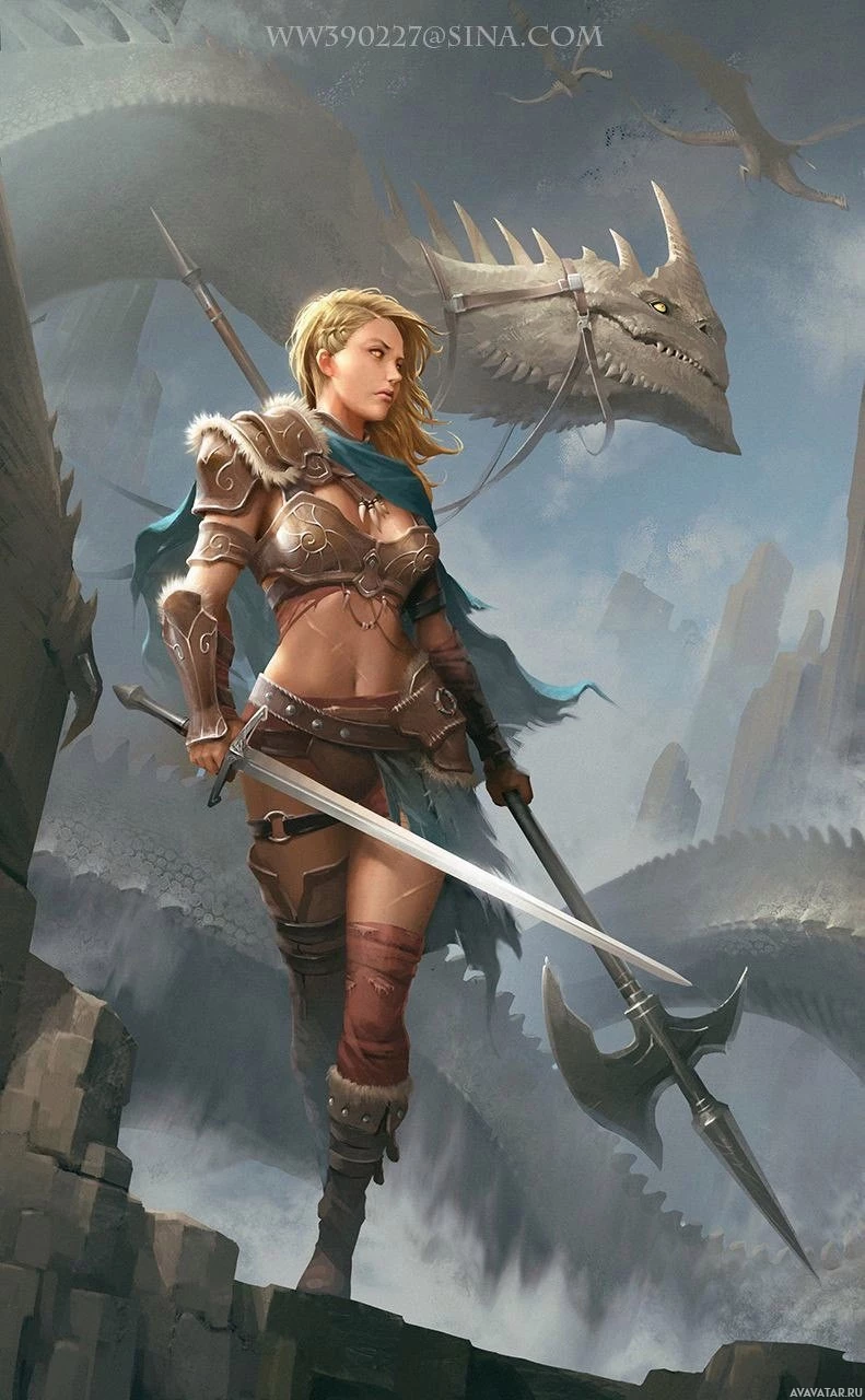 The image depicts a fantasy-themed illustration featuring a woman dressed in