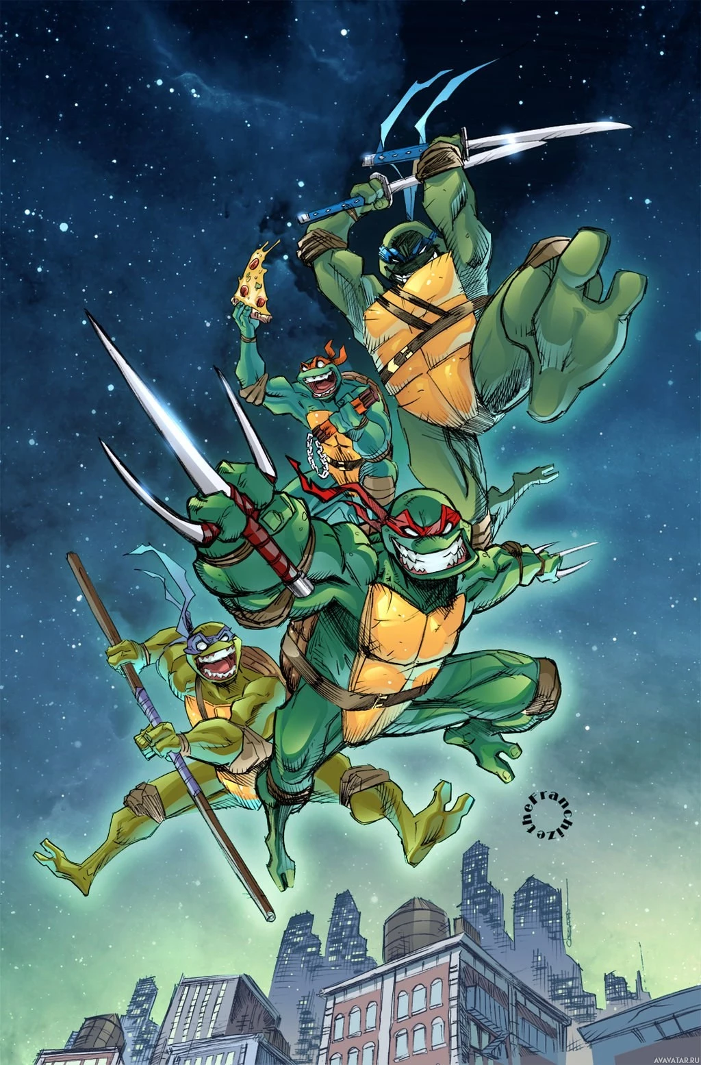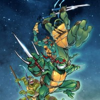 a comic book featuring the Teenage Mutant Ninja Turtles. It depicts three of the turtle characters in