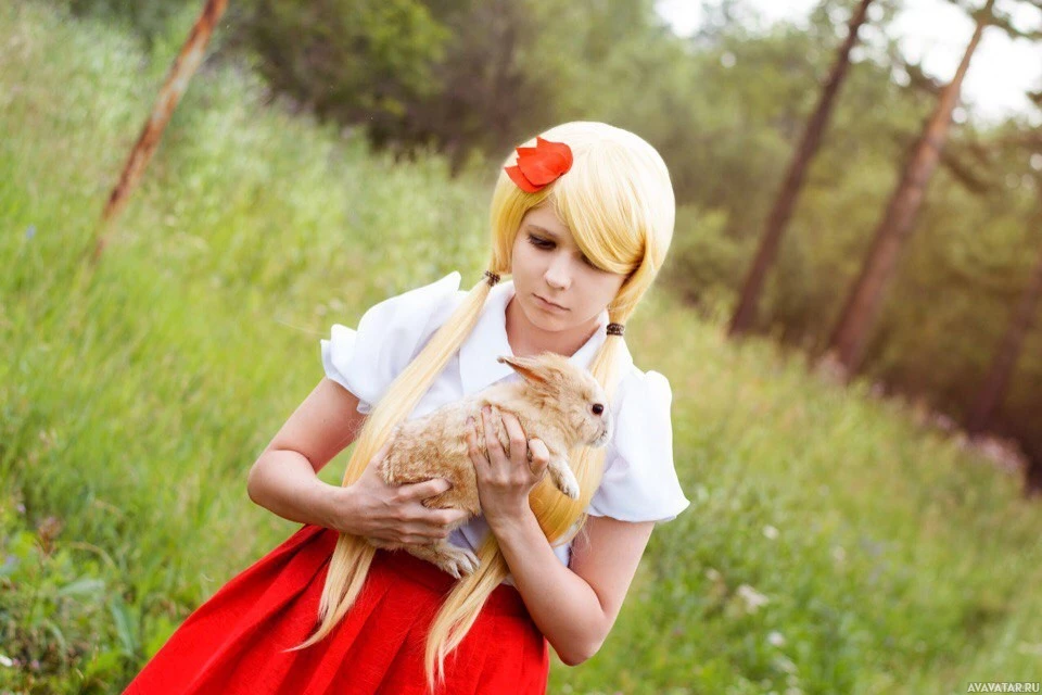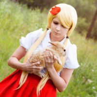 In the picture, there is a woman who appears to be an anime character. She has blonde hair and is wearing a maid-like uniform with red accents. The woman is holding what seems to be a small rabbit or similar animal in her arms. There are no other distinct objects in the image that can be confidently identified.