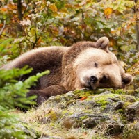 green foliage that suggests it might be autumn, as indicated by the changing colors of the leaves around the sleeping bear.
